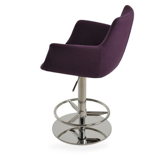 Bottega Piston is a unique stool with a comfortable upholstered seat and backrest on an adjustable gas piston base which swivels and also adjusts easily from a counter height to a bar height with a lever that activates the gas piston mechanism.