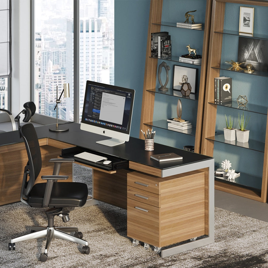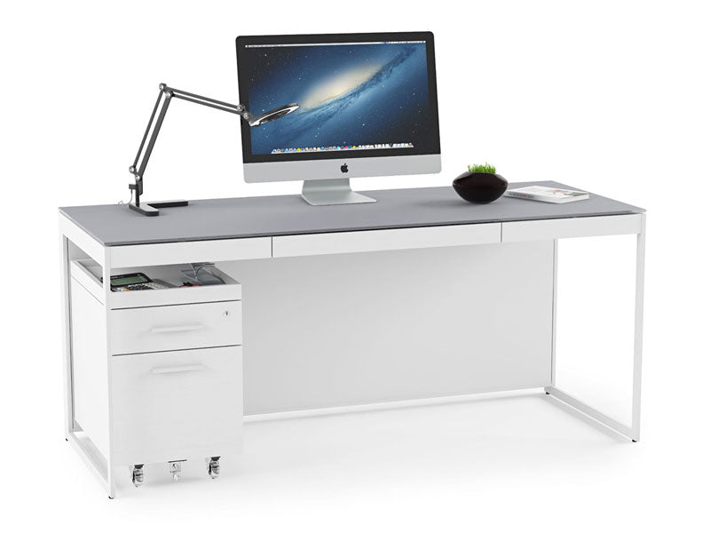 The CORRIDOR Desk’s micro-etched glass top provides a smooth, non-glare work surface. It includes a a center multifunction keyboard drawer and two side storage drawers. A recessed modesty panel allows for cross desk collaboration.