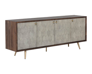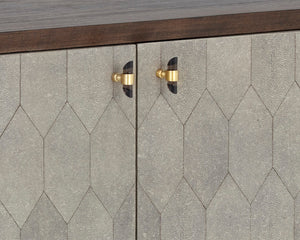 106145 -"Create an intriguing living or dining space with this stunning sideboard. Crafted from acacia veneer with a white ceruse finish, each cabinet door featuring a unique taupe shagreen-textured bonded leather shagreen cover. Four cabinets provide ample storage. Acrylic and gold metal pulls complete the look.
