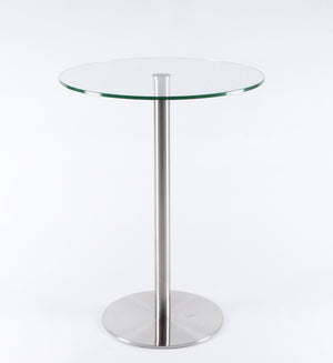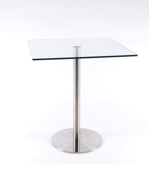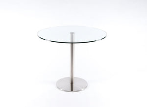 12mm thickness Tempered glass top. Brushed stainless steel pedestal base.