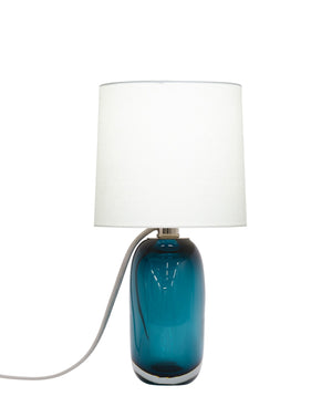 This diminutive handcrafted glass table lamp delivers a unique aesthetic thanks to its sleek profile and polished nickel finish. The blue glass base poses an intriguing contrast to the sophisticated off-white linen lampshade. Design note: The cloth cord comes out of the socket.