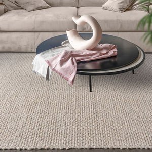 This hand woven wool rug uses alternating sizes of loop construction in various beige tones for a casual organic feel.