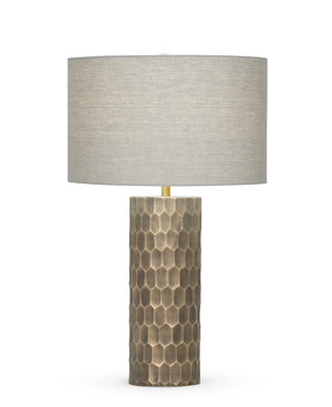 In this table lamp, mouth-blown glass is hand-etched and covered in a dark, hand-etched brass-plated finish. In combination with the Charcoal Grey cotton shade, the lamp looks luxe yet casual. Place in a bedroom for a modern, moody accent. Because it’s handmade, the lamp’s finish may vary.