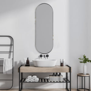 This simple metal pill shaped mirror is enhanced with beautiful gold knobs that attach the frame. Finished in a matte black, this frame may be hung either vertically or horizontally.