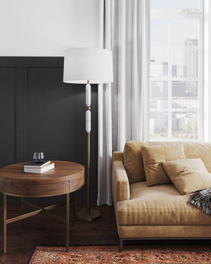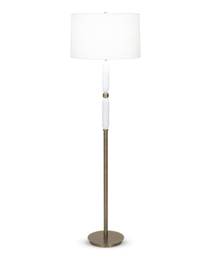 Two white marble cylinders decorate the stem of this standard floor lamp, creating an elegant, trendy look against the Antique Brass body. An Off-White linen tapered drum shade tops the look. Place this lamp in a living room reading nook for style and function.