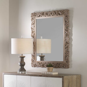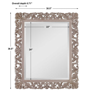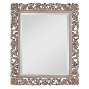 This beautiful, ornate frame features a natural finish. The mirror has a 1" bevel. May be hung either vertically or horizontally.