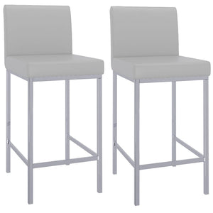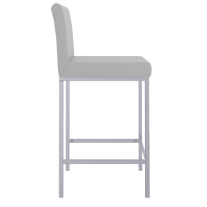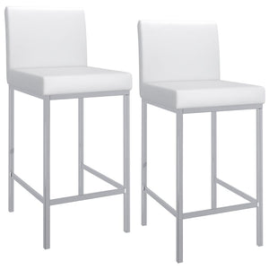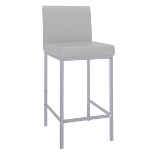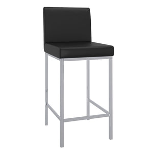 Contemporary counter height stool with faux leather and shiny chrome finishing. Combined, these two materials create a modern piece that will work will with any decor. The low back provides ample back support while adding to the minimalist appeal. Great for a casual breakfast bar or for the fancy basement bar where you can spend hours conversing with guests.