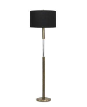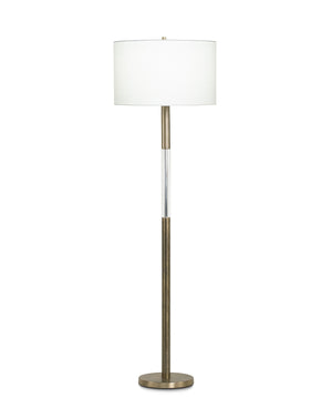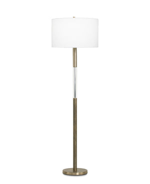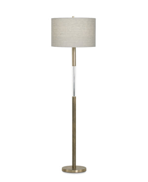 Crystal mixes with Antique Brass-finished metal in this modern and elegant floor lamp. Its slim body is a study in material juxtaposition, while the round base and drum shade balance the silhouette. Place this lamp in a living room next to a sofa for a classy yet understated source of illumination.