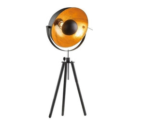 This table lamp is in a black or grey finish. It has tripod frame and a shiny gold leaf interior shade for black and silver interior for grey. It is great for chair side reading or general room illumination.
