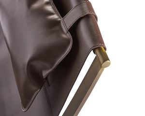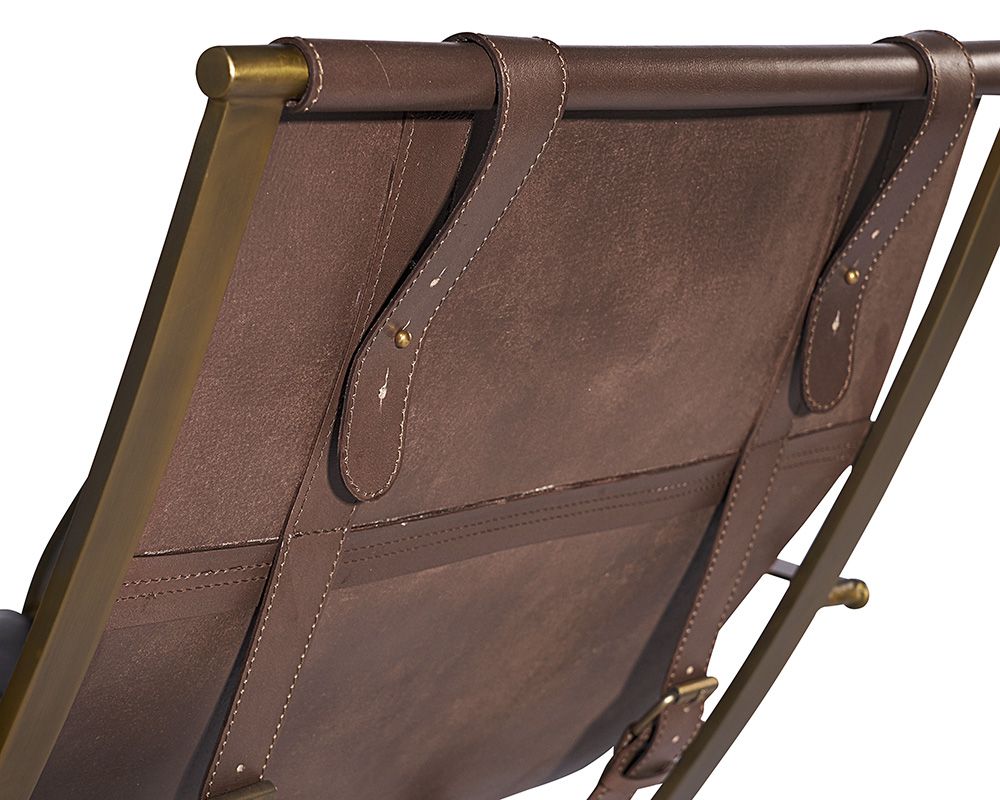 This contemporary sling style occasional chair will invite guests to lounge and relax. Handcrafted in India with brown leather and a brass frame.